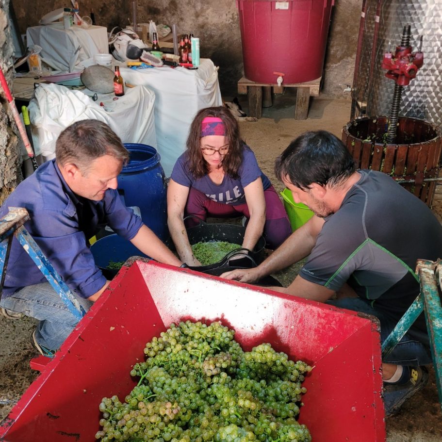 En la Vendimia: Se remangan para recuperar la tradición. No hay máquinas, hay manos, risas y el esfuerzo compartido de recoger el fruto como se hacía antes.